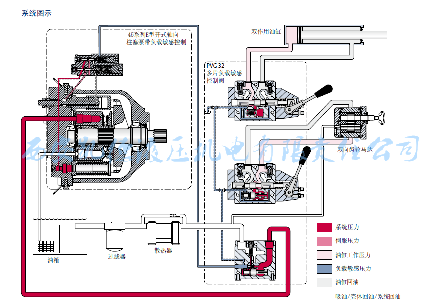 概述:變量泵供油的負(fù)載敏感系統(tǒng)。變量泵通過(guò)吸油管直接從油箱吸油,泵工作輸出高壓油,向PVG閥供油。PVG閥可選擇控制驅(qū)動(dòng)馬達(dá)、液壓缸或其它執(zhí)行機(jī)構(gòu)的方向和流量。