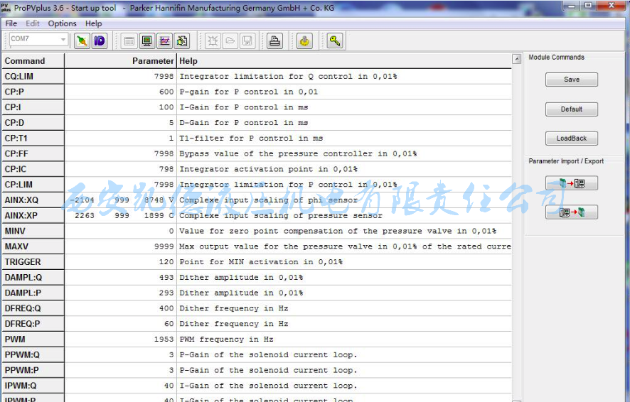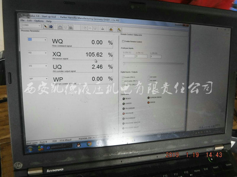 派克PV泵排量從16cc至270cc,有多種控制方式,廣泛應用于注塑機、壓鑄機、油壓機、船舶機械、工程機械行業(yè)等。該液壓泵的型號總稱為:PV180R1L1T1NUPR。PV泵UPR控制是帶壓力補償越權監(jiān)控的電液比例排量控制器,UPR型比例排量控制器采用轉接閥塊的安裝方式,在轉接閥塊上安裝一個電液比例排量控制閥和一個壓力補償、變量控制閥。比例排量控制器可通過指令電信號調節(jié)泵的輸出流量。該型控制功能的泵上安裝有一個線性位置傳感器(LVDT),用以檢測泵的實際排量,并將該實際排量信號反饋至PQDXXA-Z00電子控制模塊。繼而控制模塊通過指令電信號輸出至電比例排量控制閥以調節(jié)泵的輸出流量。排量指令信號為電信號(0 - 10 V),可由上位控制器或電位器給定,以此監(jiān)測控制泵的實時工作。電腦使用軟件為PARKER專業(yè)比例伺服閥調試軟件ProPVplus。